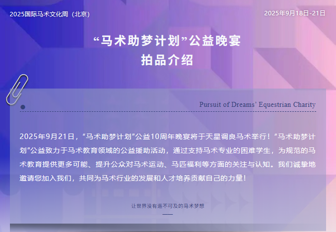 “马术助梦计划”公益致力于马术教育领域的公益援助活动,通过支持马术专业的困难学生,为规范的马术教育提供更多可能、提升公众对马术运动、马匹福利等方面的关注与认知。