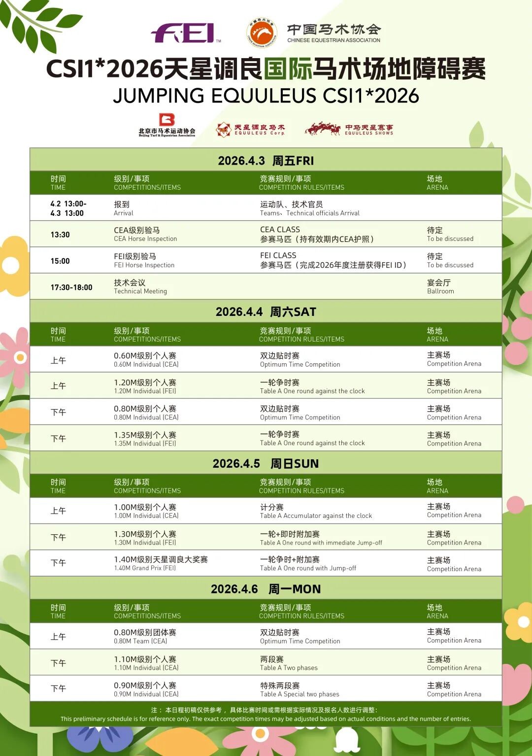 (一)各参赛运动队请于2026年4月2日按规定时间进马及报到。报到时请同时提交马匹护照和马匹检疫证明,未提交相关证明的马匹不得进入马厩。参赛马匹均须按国际马联相关规定注射流感疫苗,并在护照及FEI HorseApp进行详细记录,无疫苗或疫苗不符合国际马联要求的马匹,组委会有权拒绝其参赛。