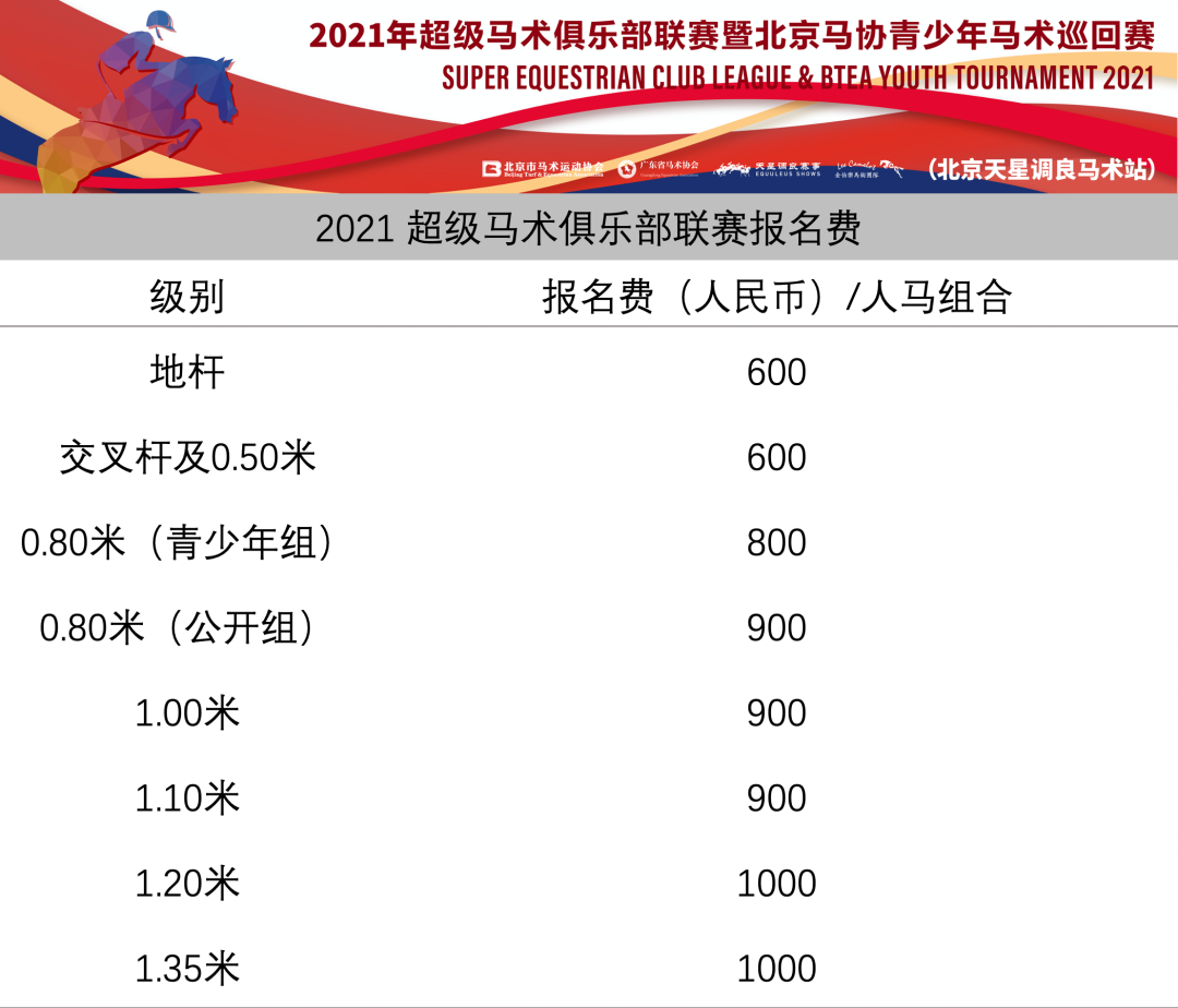 3、若只报名“2021超级马术俱乐部联赛”,请按照表1缴纳报名费。
