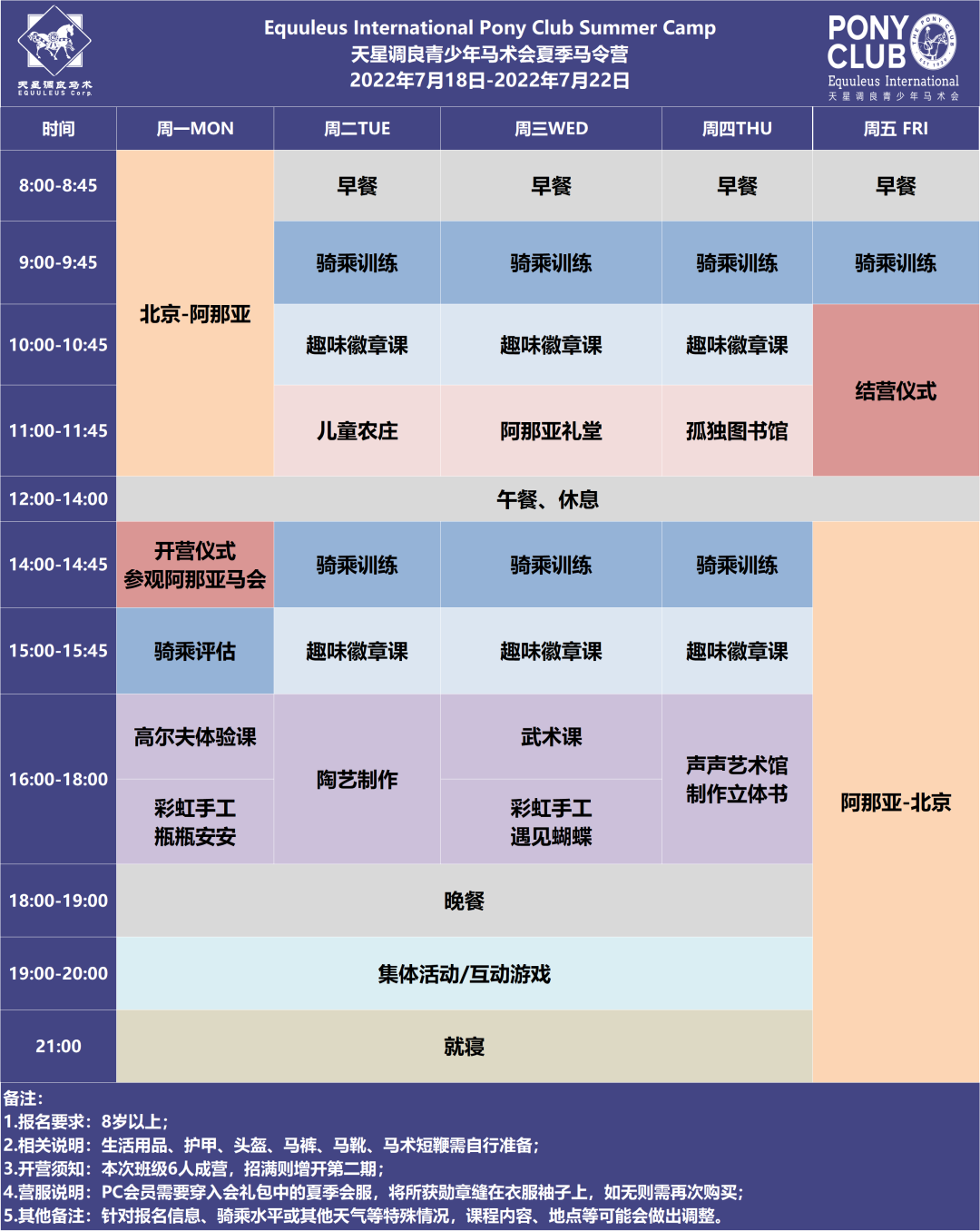 天星调良国际青少年马术会( Equuleus International Pony Club )联合阿那亚马会于2022年7月18日-22日在阿那亚黄金海岸共同举办夏季骑乘训练马令营。