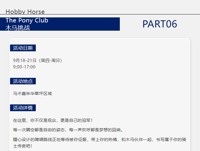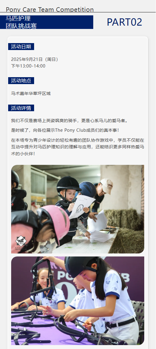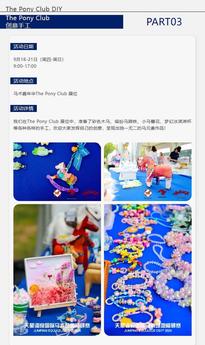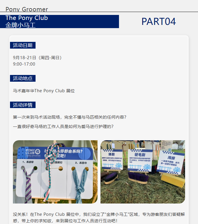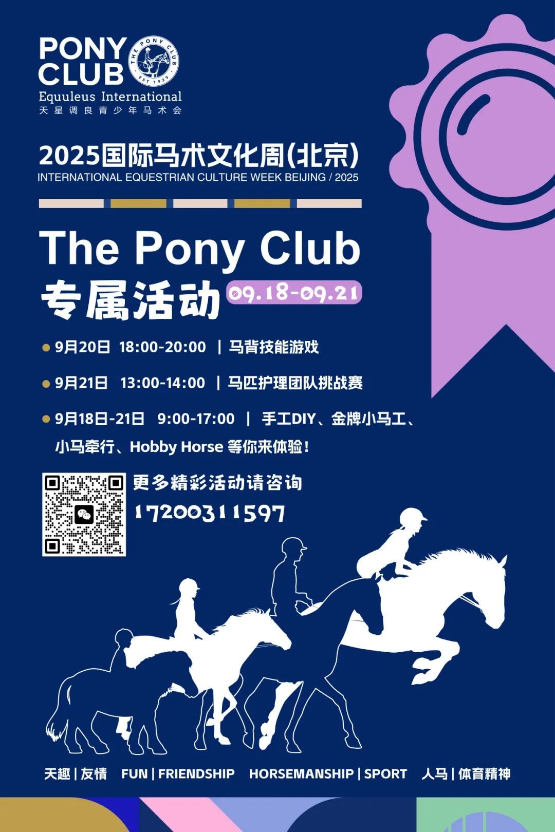 9月18-21日,2025国际马术文化周(北京)期间,天星调良国际青少年马术会Equuleus International Pony Club将举行系列精彩活动,来Pick你感兴趣的活动,抢先收好这份「活动剧透清单」吧!