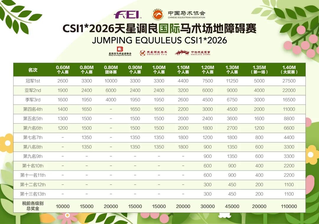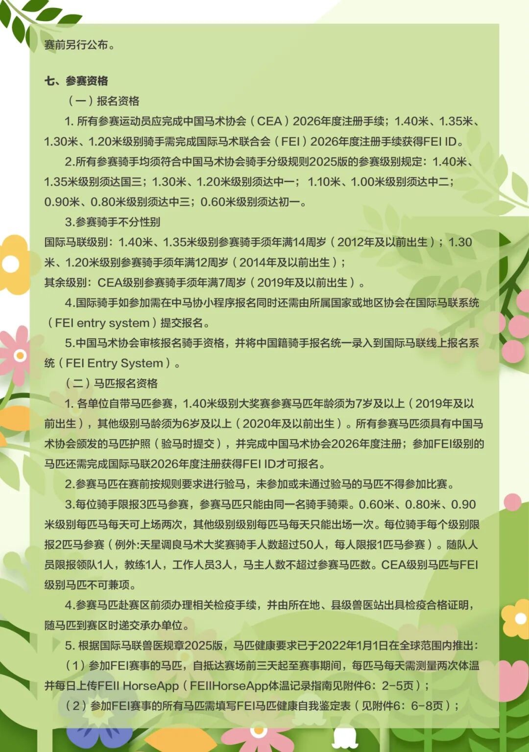 (一)各参赛运动队请于2026年4月2日按规定时间进马及报到。报到时请同时提交马匹护照和马匹检疫证明,未提交相关证明的马匹不得进入马厩。参赛马匹均须按国际马联相关规定注射流感疫苗,并在护照及FEI HorseApp进行详细记录,无疫苗或疫苗不符合国际马联要求的马匹,组委会有权拒绝其参赛。
