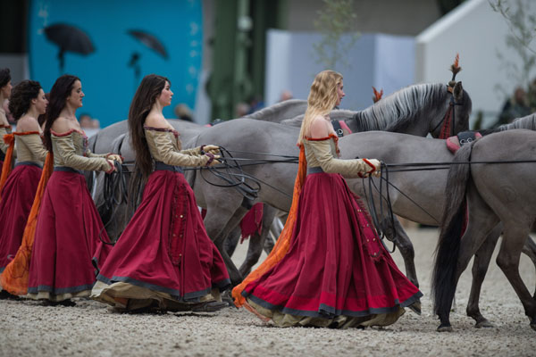云集了40余位“马林高手”的竞技紧锣密鼓地进行着,比赛中场和每天接近赛事结束时的马术表演,不仅舒缓了我激动的观赛心情,更是让人眼前一亮。由著名调马师 Bartabas 编排的表演《驰骋自然万物间》Nature at Full Gallop——五匹激情不羁的脱缰种马在赛场里尽情演绎,让大家惊叹不已。