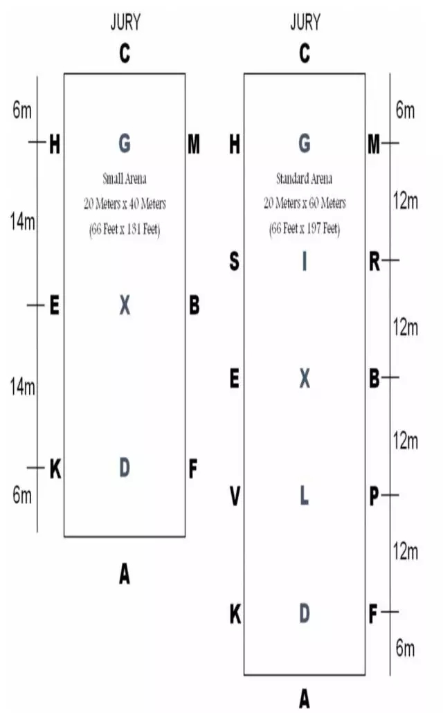 短边中央线位置分别是A点和C点。由A 点进入场地。从短边到第一个字母的距离为6米,其余长边字母间隔为12米。