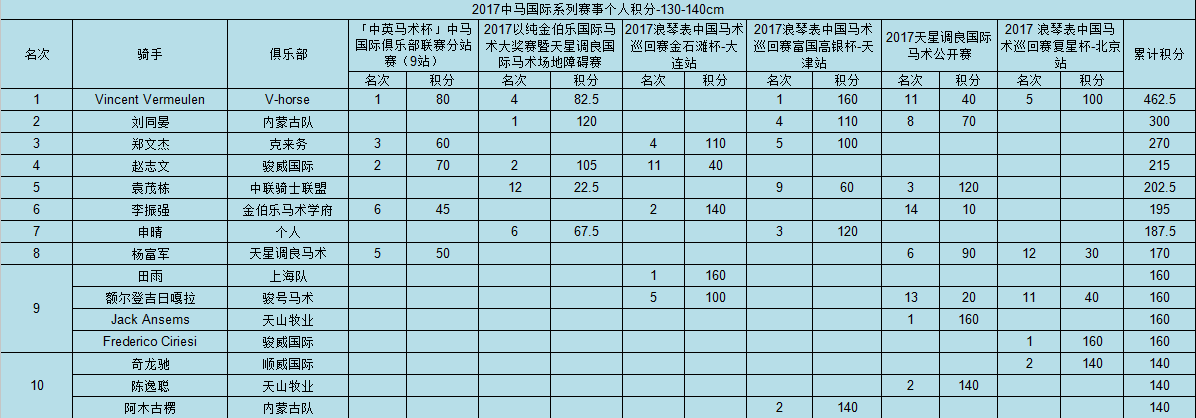 2)2017年度中马国际马术俱乐部联赛十场分站赛个人的积分计算规则