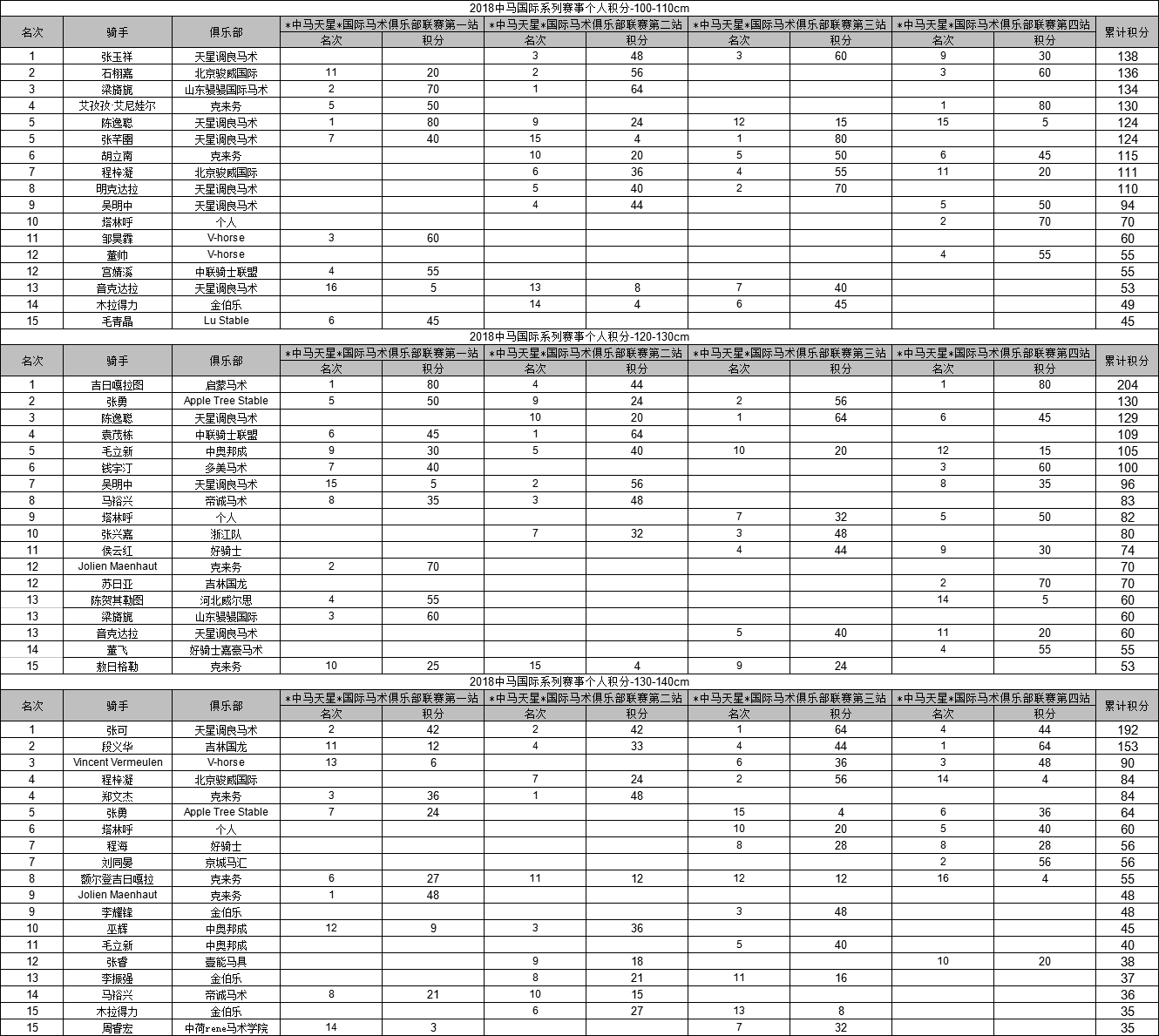 *中马天星*国际马术俱乐部联赛为2018中马国际系列赛事“大积分”系统赛事,参与联赛获取个人积分,凡年度大积分榜排名靠前者将有机会获得“中马国际场地障碍赛欧洲联赛”的参赛资格及丰厚海外赛事专项赞助奖励! 赛事相关事宜及报名方式如下: 赛事相关事宜 *中马天星*国际马术俱乐部联赛 *中马天星*国际马术俱乐部联赛为2018中马国际马术俱乐部联赛系统赛事,赛事数量暂定“10+1”场。 竞赛日程:(暂定) 第一站:3月31日~4月1日 第二站:5月12日~5月13日 第三站:6月9日~6月10日 第四站:6月23日~6月24日 第五站:7月21日~7月22日 第六站:8月11日~8月12日 第七站:9月1日~9月2日 第八站:10月27日~10月28日 第九站:12月22日~12月23日 第十站:12月29日~12月30日 总决赛:1月12日~1月13日(2019年) 注:若遇天气、场地原因,竞赛日程将相应调整,请以赛时赛事组委会通告为准;每站竞赛日程将在报名截止后,并综合考虑比赛当日天气情况,于赛前另行公布。 竞赛项目 (一)地杆级别个人赛 (二)交叉杆及0.50米级别个人赛 (三)0.80米级别个人赛(青少年组) (四)0.80米级别个人赛(公开组) (五)1.00米级别个人赛 (六)1.10米级别个人赛 (七)1.20米级别个人赛 (八)1.35米级别个人赛 备注:高度级别为每个组别的最高高度限制,不代表全场障碍高度。 参赛资格 (一)各参赛单位参赛骑手不限。 (二)每站比赛,每位骑手每个级别限报3匹马参赛,每匹参赛马限报2个级别。 (三)各单位自带马匹参赛,参赛马匹马龄须为6岁及以上(2012年及以前出生)。 (四)参赛马匹赴赛区前须办理相关检疫手续: 1、同区域(即北京市朝阳区)的参赛马匹须提交《动物免疫健康证》 2、跨区域的参赛马匹须由所在地县级、区级相关检疫单位(农业行政许可受理大厅)开具《动物检疫合格证明》 3、参赛马匹到赛区报到时须递交赛事组委会马匹相关检疫证明 4、未递交《动物免疫健康证》或《动物检疫合格证明》的马匹不得进入马厩、不得参加比赛 5、为确保人马平安,请各参赛单位及人员给予理解及配合。 (五)每站比赛,参赛骑手须于赛前购买相应保险,并于报到时将赛事有效保险单提交至赛事组委会,未提交有效保险单的骑手不得参加比赛。 (六)参赛骑手须按比赛规定着装,不符合规定的,将被取消比赛资格。场地障碍赛着装要求:头盔、骑士服(根据天气情况调整)、白领带、白马裤、马靴。 (七)参赛骑手须服从裁判判罚,若出现惩罚马匹等有悖“马匹福利高于一切”原则的行为,赛事组委会将慎重考虑其下一站的参赛资格。 (八)专业人员参加0.50米及以下级别只作为测试,不计成绩。 竞赛规则 (一)比赛采用国际马联颁布的第26版国际马联场地障碍竞赛规则(2018年1月1日更新) (二)地杆级别为贴时赛(贴近最佳时间)。 1、行进速度每分钟240米。马匹碰到地杆不罚分。 2、1次未能通过地杆罚4分,2次未能通过地杆罚8分,3次未能通过地杆骑手被淘汰。 3、最佳时间比允许时间短4秒。超过允许时间,每4秒罚1分。 4、超过限定时间,骑手被淘汰。 5、罚分少者,名次列前,若罚分相同,则以比赛用时接近最佳时间者,名次列前。 6、为公平公正,当选手通过起点线,赛场成绩显示屏暂不显示选手行进时间;待选手通过终点线前/后(根据路线设计,显示屏背对/相对选手行进路线而定)赛场成绩显示屏显示选手成绩。观众仍可通过成绩系统在线链接/APP查看实时成绩。 (三)交叉杆及0.50米级别为贴时赛(贴近最佳时间)。 1、行进速度为(室外)每分钟325米或(室内)每分钟300米。 2、马匹打落一道障碍罚4分,拒跳1次罚4分,拒跳3次骑手被淘汰。 3、最佳时间比允许时间短4秒。超过允许时间,每4秒罚1分 4、超过限定时间,骑手被淘汰。 5、罚分少者,名次列前,若罚分相同,则以比赛用时接近最佳时间者,名次列前。 6、为公平公正,当选手通过起点线,赛场成绩显示屏暂不显示选手行进时间;待选手通过终点线前/后(根据路线设计,显示屏背对/相对选手行进路线而定)赛场成绩显示屏显示选手成绩。观众仍可通过成绩系统在线链接/APP查看实时成绩。 (四)1.00米、0.80米(青少年组)、0.80米(公开组)级别为两段赛,按照国际马联场地障碍规则274.5.2执行。 1、室外赛行进速度每分钟350米(室内赛行进速度每分钟325米)。 2、比赛分两段进行,若参赛骑手在第一阶段有罚分,则请在裁判响铃后自动离场。 3、若参赛骑手在第一阶段零罚分,则直接进入第二段争时赛。 4、若第二段罚分相同,第二段用时少者,名次列前。 5、0.80米(青少年组)、0.80米(公开组)级别竞赛路线等赛制相同,但分别记取成绩、排名、颁发奖项。 (五)1.20米、1.10米级别为一轮+即时附加赛(Immediate Jump Off),按照国际马联场地障碍规则238.2.2执行。 1、行进速度每分钟350米。 2、若骑手第一轮零罚分,裁判将再次敲铃,骑手在45秒之内直接进入即时附加赛。 3、附加赛争取时间,若罚分相同,用时少者,名次列前。 4、若第一轮无零罚分骑手,则无选手需进入即时附加赛,按照国际马联场地障碍规则238.2.1执行,罚分少者,名次列前,若罚分相同,则用时少者,名次列前。 5、骑手看路线时,需同时看附加赛路线,赛事组委会不另安排时间走附加赛路线。 (六)1.35米级别为一轮+附加赛(Jump Off),按照国际马联场地障碍规则238.2.2执行。 1、行进速度每分钟350米。 2、若第一名的骑手出现罚分相同,则进行附加赛。 3、附加赛将在第一轮比赛结束后统一